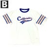 環境に配慮して生産されたサステナブルなアメリカ綿を使用したショートスリーブTシャツです。「スラブ糸」と呼ばれる表面にムラのある糸を使用した素材のため、程良い凹凸感があり、肌にまとわりつきにくいのが特長。さらに汗や湿気などの水分に対する吸熱反応により涼感をもたらす「キシリトール加工」を行った、盛夏に最適なアイテムです。胸のグラフィックは、チームスポーツのユニフォームに見られる文字とリボンを組み合わせたデザインを踏まえたもので、筆記体風の書体で「California(カリフォルニア)」とプリント。リボン状の部分に「Los Angeles(ロサンゼルス)」と入れています。両袖にはサンドイッチラインのプリント入りです。