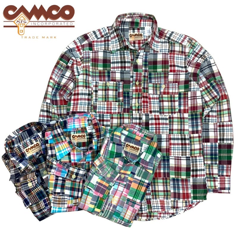 カムコのマドラスパッチワークチェックシャツです。生地は、100%コットンです。このマドラス生地は、インド・マドラス地方に出向き、多数あるマドラス生地の中から厳選し、アメリカンブランドを多数手掛けた工場で丁寧に生産しています。全て古い織り機により作られ、ネップ(織りムラ・繊維のかたまり)も再現しました。天然繊維のマドラス特有の「泣き」と呼ばれる色抜けも魅力的です。サラッとしたソフトな質感で、速乾性も高く、通年快適です。ディテールは、フロント両サイドにチェストポケットが付きます。ボタンは、丈夫なプラスチックの白い皿ボタンです。ワークシャツのデザインにマドラス生地を使用することは珍しく、希少価値の高いシャツです。
